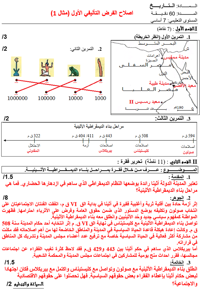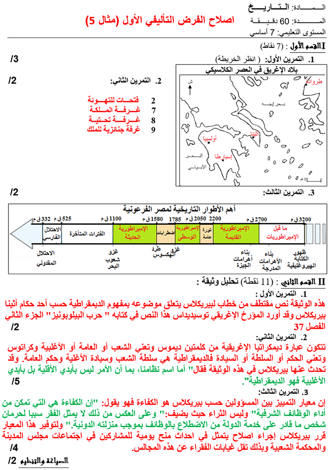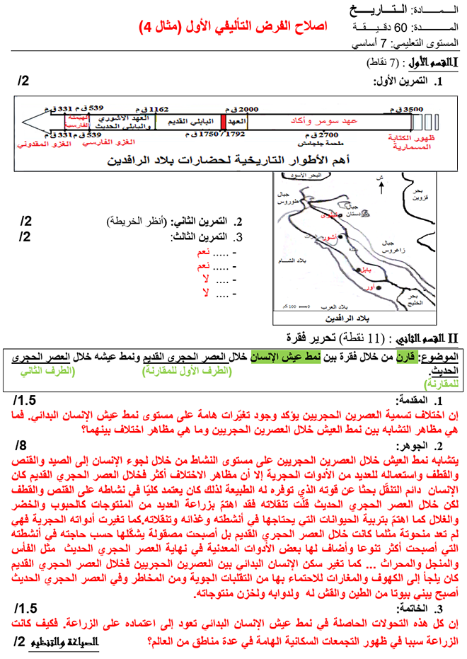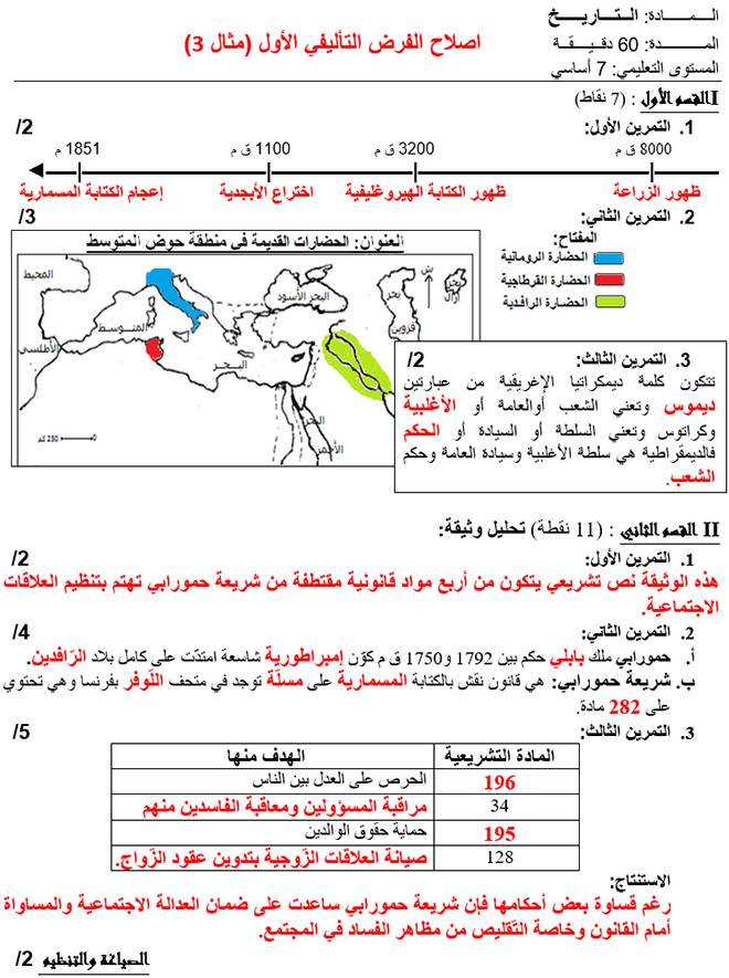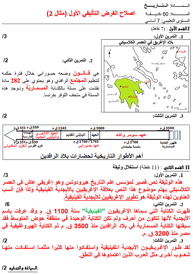 إصلاح فروض تأليفيّة عدد 1 ثلاثي أوّل تاريخ 7 أساسي